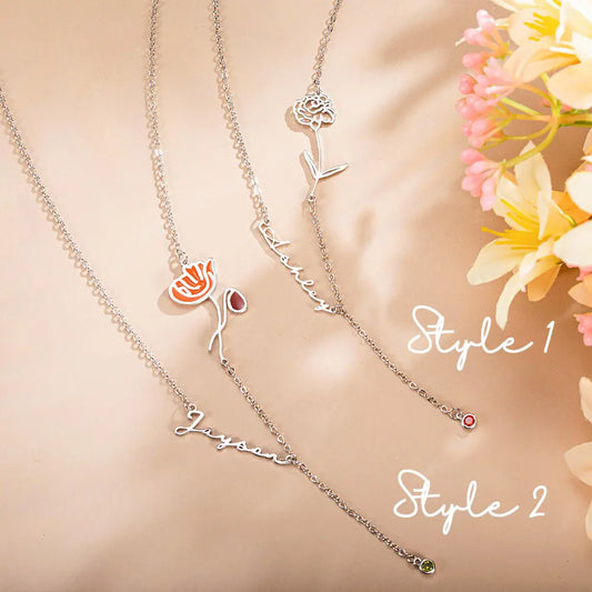 Personalised Birth Flower & Birthstone Lariat Name Necklace