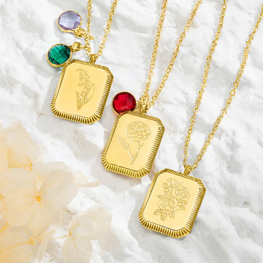 Personalised Gold Vintage Birth Flower & Birthstone Necklace