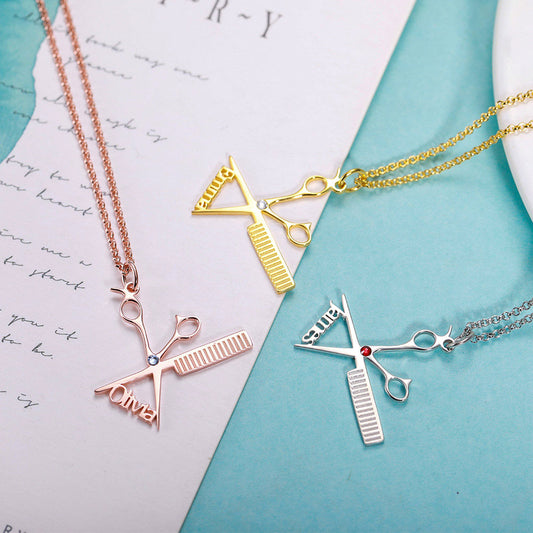 Hairdresser Personalised Scissors & Comb Name Necklace with Birthstone