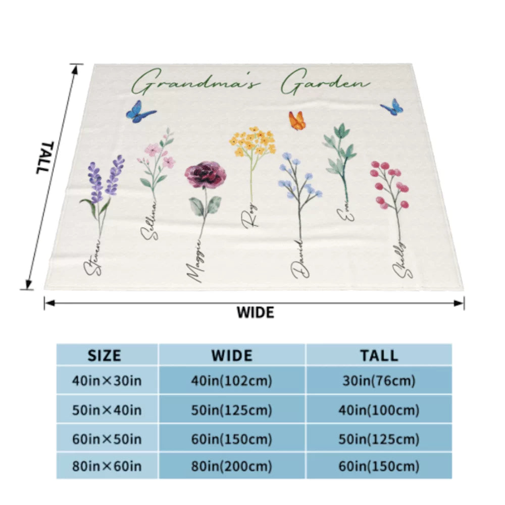 This personalised Grandma's Garden Blanket is personalised with your names and flowers of your choice. You can also change the title to any name so it's not just limited to our beautiful Grandma's. Can display to 16 names and flowers.