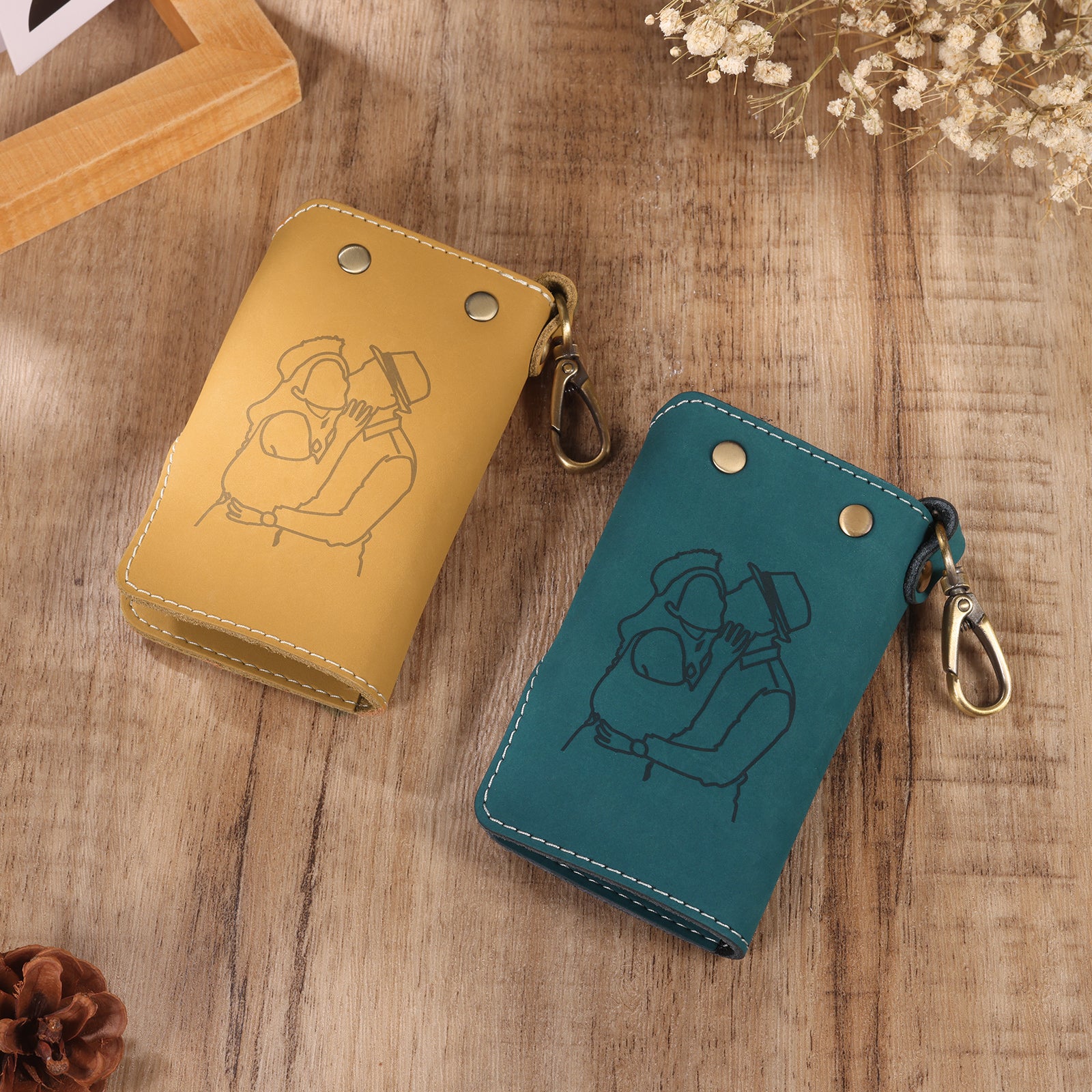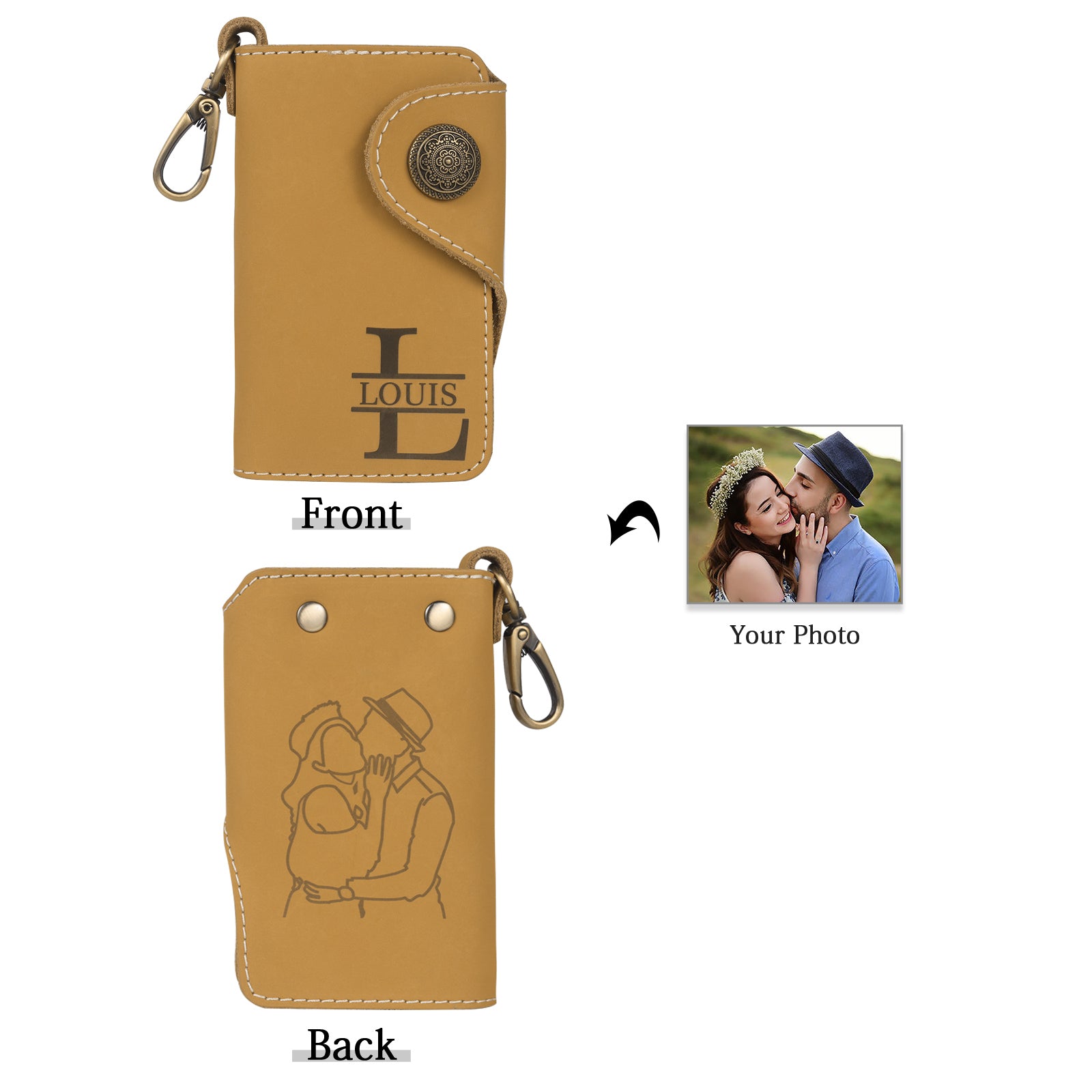 Each key wallet is personalised with your photo, initial and name, using laser engraving. For this design we would use the outline details from your photo, creating a unique eye-catching effect.